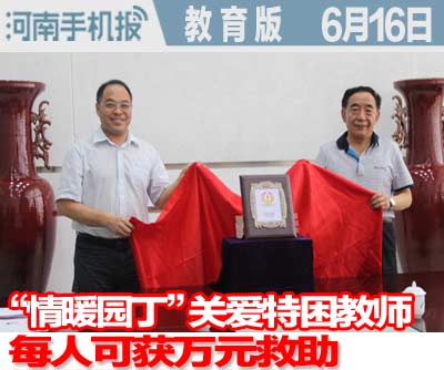 同时,教育时报社向全社会发出倡议:伸出您的援手,献出您的爱心,为“情暖园丁”专项基金注入您的真挚情怀,为河南的特困教师奉献一份爱心,为河南的教育事业贡献一份力量。(记者 赵鑫)