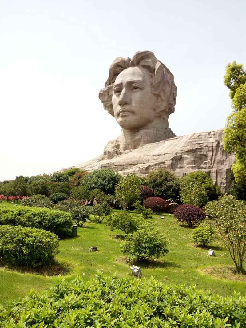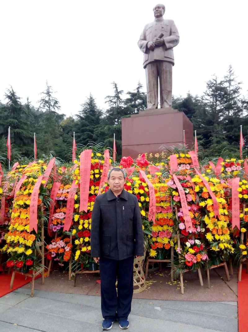 爬过一段石梯,快步来到了毛泽东广场,门口有一个花岗岩巨石,上面雕刻着中国出了个毛泽东,地面开阔,路两边植有松柏,立有花岗岩巨石,上面雕刻着毛泽东诗词。花坛中植有山茶、月季等花卉。毛泽东铜像座西南,朝东北,身躯伟岸,双手紧握讲话稿,身着中山装,目视前方,仿佛洞察世上风云变幻。我从服务站买来一个花蓝,花带由我亲笔书写,左侧是丰功伟绩,永垂千古,右侧是华夏儿女,永远怀念您,右下角落款是我和爱人及女儿全家的名子。我和妻子搀扶着花蓝,踏着红地坛,迈上台阶,来到主席像前,久久伫立。突然2岁的外孙,手拿一朵鲜花,跑上前,放在花蓝上。我们四人一起三鞠躬。凝望着高大的毛主席像,我忽然想起,1976年9月9日毛泽东逝世的噩耗,传到了家乡张完,人们悲痛欲绝,开追悼会那天,随着悲哀的音乐响起,全场哭声震天,仿佛江河咆哮,日月流泪、大地哭泣、仿佛高大的山脉也潸然泪下。