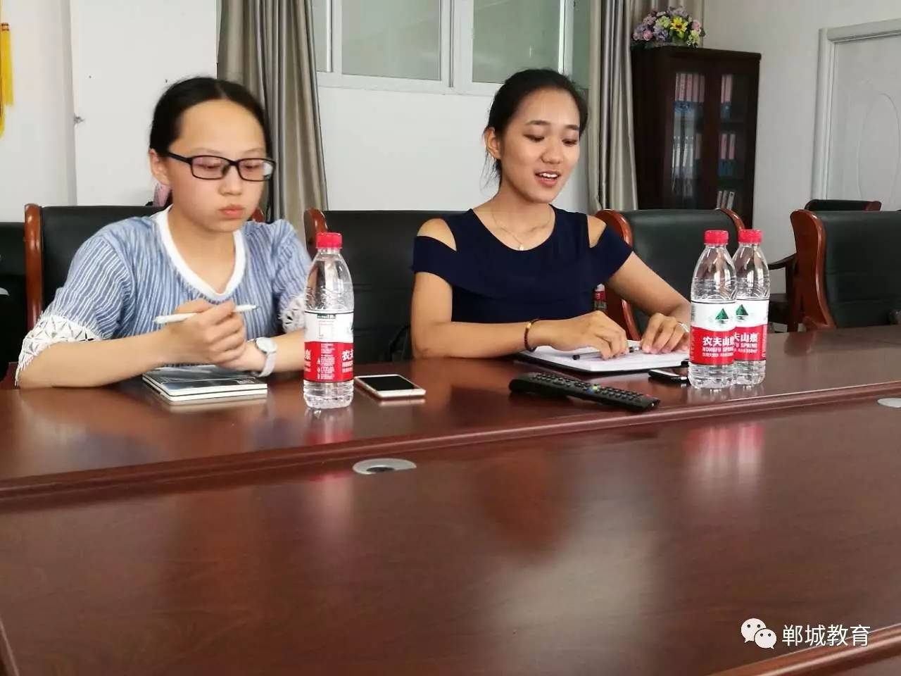 照片右边的女孩叫刘悦,淮阳县人,北京11学校高中应届毕业,李希贵校长的助理,高中期间选读大学先修课程,目前已接到美国范德堡大学、波士顿学院荣誉项目等7所高校的录取通知,8月中旬即将赴美读大学。照片左边的女孩叫张冉玥,郸城一高应届毕业生,目前已被北京大学录取。7月19日下午,回家探亲的刘悦慕名来到郸城县教体局,和张冉玥以及郸城县几位教育工作者进行了一次对话,两位准大学生介绍了各自学习成长历程,分享了各自学校的管理文化、课程设计、学校生活等,对语文教育、家庭教育、高考等问题发表了自己的看法。