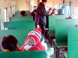 乘客不多,来得最早的是一家四口,下午2点开车,中午12点刚过就到了,年轻的父母,轮流抱着最小才7个月的孩子,在寒风中等了近两个小时。他们家就在本县乡下,却是第一次坐这趟车,因为要去邻县串亲戚,一打听只有小火车最顺路,所以才来试试。因为不熟悉情况,所以来得早了。