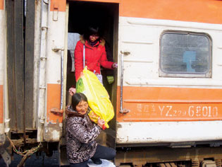 ●车慢吞吞停下,十几个乘客陆续下车,有互相搀扶的老人,也有穿着鲜艳羽绒服的年轻人,行李车也打开了,列车员帮着往下卸下各种货物,还有乘客的电动车、三轮摩托