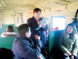 列车虽小,但车组配备齐全,两节客运车厢,共有6名车组人员,一个司机,一个乘警,一个车长,两名乘务员,一名维修工人。这些车组人员,最少也在车上干了五年以上,收入微薄,工作辛劳,但每个人都很敬业。安顿好了乘客之后,乘警和列车长在车尾安静地聊天,从某只股票的涨势,聊到最近的“天价过路费”新闻,间或也跟乘客一样打起盹来。不过,每当火车将要靠站,列车长都会提前起身,打开火车后部的门,探出身子认真地瞭望,举起红绿两色的旗子指挥车辆进出站。
