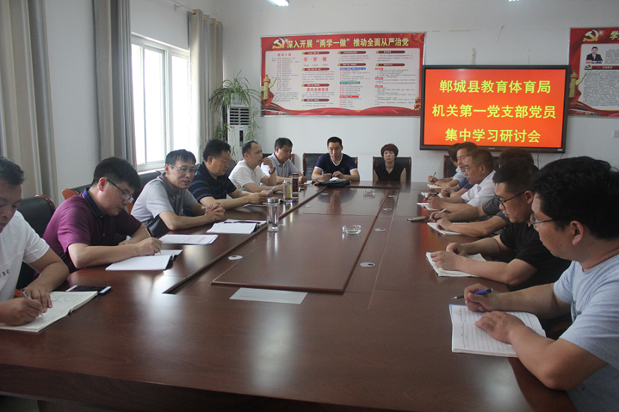 6月16日下午,郸城县教体局第一支部全体党员组织开展学习交流研讨活动,支部党员共同上党课、话廉洁、讲环保、谈发展。县教体局第一党支部书记张本宝主持活动。